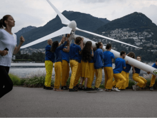 Активісти Greenpeace піднімають вітряну турбіну напередодні дводенної конференції з відновлення України. Лугано, 4 липня 2022…