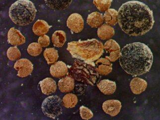 Под микроскопом крошечное удлиненное семя мака, маленькие рыжевато-коричневые мегаспоры колоскового мха и сферы черного почвенного…