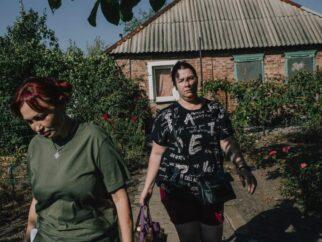 Юлия Сокол, слева, из волонтерской организации «Точка отсчета» помогает эвакуировать Валерию Танащук из их дома…