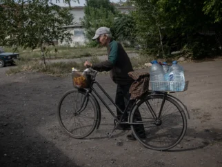 В понедельник жители набрали воду из нового распределительного пункта в ключевом восточном городе Покровске, Украина.…