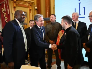 Министр иностранных дел Великобритании Дэвид Лэмми (слева) наблюдал за тем, как госсекретарь Энтони Блинкен (в…