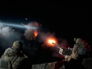 Украинская мобильная группа ПВО ведет огонь по дрону «Шахед» из советской 23-мм спаренной зенитной установки…
