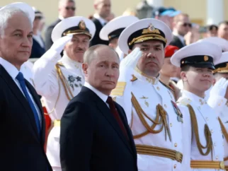 Президент России Владимир Путин и члены его кабинета на военном параде в Санкт-Петербурге, июль 2024…