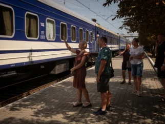 Традиционное махание на прощание родственникам, когда они уезжали на эвакуационном поезде из Покровска, Украина, в…