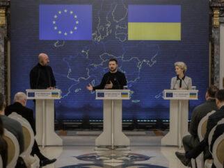 Президент Украины Владимир Зеленский (в центре), председатель Европейского совета Шарль Мишель (слева) и председатель Европейской…