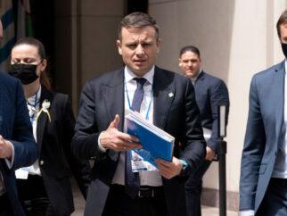 Министр финансов Украины Сергей Марченко, держащий бумаги, в Вашингтоне в прошлом году. ФОТО: ХОСЕ ЛУИС МАГАНА/АССОШИЭЙТЕД…