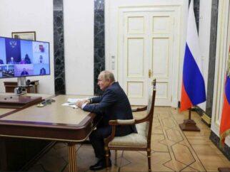 Фотография, опубликованная российскими государственными СМИ, на которой изображен президент Владимир Путин во время заседания Совета…
