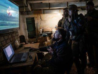 Солдаты украинского батальона «Карпатская Сечь» просматривают кадры с беспилотников за линией фронта в мае. Фото…Линси…