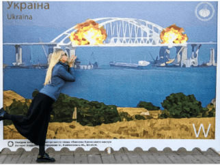 Украинцы фотографируются на фоне представления коллектива художников о взрывах на мосту через Керченский пролив в…