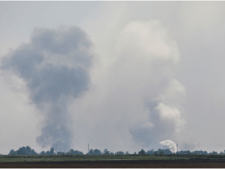 На снимке виден дым, поднимающийся над местностью после предполагаемого взрыва в селе Майское Джанкойского района,…