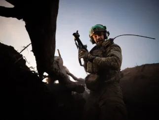 Украинский солдат отбивает российскую атаку на передовой позиции под Торецком в прошлом месяце. Украинские войска…