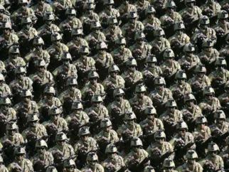 Северокорейские солдаты во время парада в Пхеньяне. Фотограф: Kyodo/AP Photo Первая группа солдат уже проходит…