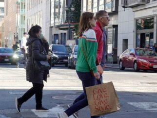Пешеход несет сумку с покупками во время прогулки по Юнион-сквер 16 ноября 2022 года в…