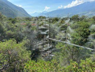 Установленные на строительных лесах форсунки под высоким давлением распыляют в воздух мельчайшие капельки воды, которые…