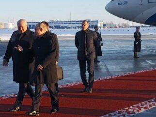 Президент Беларуси Александр Лукашенко, слева, разговаривает с президентом России Владимиром Путиным в аэропорту Минска, Беларусь,…