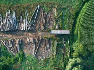 Дверь члена ЕС приоткрыта для нелегального импорта Частично расчищенный склад древесины, вид с воздуха, Бельгия,…