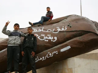 Дети позируют рядом со свергнутой статуей Башара Асада Фото: Juma Mohammad/Shutterstock 13-летнее восстание против режима Башара…