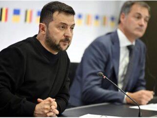 Президент Украины Владимир Зеленский и премьер-министр Александр Де Кроо после встречи в Брюсселе в октябре…