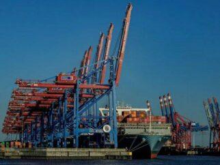 Контейнеровоз в порту Гамбурга в Германии в прошлом месяце. Падение экспорта частично связано с уменьшением…