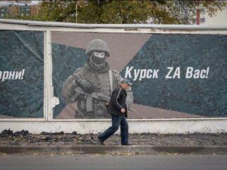 Мужчина проходит мимо стены в Курске, украшенной транспарантами в честь российских военнослужащих, 17 октября 2024…