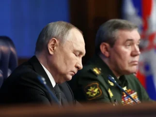 Фотография, опубликованная российскими государственными СМИ, на которой президент России Владимир Путин (слева) и начальник Генерального…