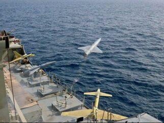 Иранский беспилотник летит рядом с военно-морским кораблем, 25 августа. ФОТО: -/МИНИСТЕРСТВО ОБОРОНЫ ИРАНА/AFP ЧЕРЕЗ GETTY IMAGES…
