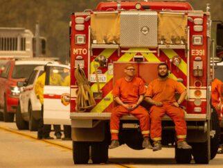 На фото: Заключенные-пожарные сидят на задней части пожарной машины, отдыхая от пожара Медведя, в некорпоративном…