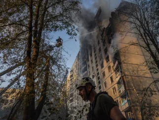 Украинские пожарные боролись с пожаром в многоквартирном доме после российской бомбардировки в Харькове, Украина, в…