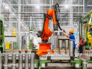 Рабочие собирают управляемых компьютером роботов и потокообразующие машины на новом заводе по производству артиллерийских боеприпасов…