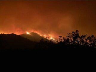 Снижение риска лесных пожаров в бассейне реки Кламат Вдоль линии хребта пылает огонь Мак-Кинни, окруженный…