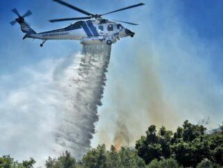 Вертолет пожарной службы округа Санта-Барбара сбрасывает воду. Он может вместить 1000 галлонов за рейс. (Фото…