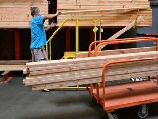 Мужчина загружает доски размером два на четыре дюйма (38х89 мм) на свою тележку в секции…