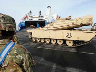 Американский танк Abrams был разгружен в немецком порту для международных военных учений. ПАТРИК СТОЛЛАРЦ/АГЕНТСТВО ФРАНС-ПРЕСС/GETTY IMAGES…