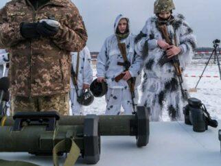 Украинские солдаты тренируются с предоставленным США оружием, используемым для уничтожения бункеров возле Яворова, Украина, всего…