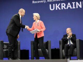Премьер-министр Украины Денис Шмыгаль (слева), обмениваясь рукопожатием с председателем Европейской комиссии Урсулой фон дер Ляйен,…