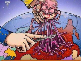 Надпись на заглавном снимке: “Специальная операция по удалению раковой опухоли” М.П. Солдаты идут среди подбитых…