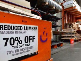Партия досок со скидкой видна, когда люди покупают пиломатериалы в магазине Home Depot в Альгамбре,…