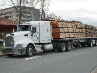 Большой грузовик, загруженный пиломатериалами, припаркован на проезжей части в Редвуд-Сити, штат Калифорния, 19 февраля. 19.…