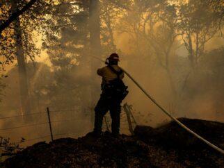 На фото: Частный пожарный наблюдает за возгоранием вдоль платной дороги Олд Лоули во время Стеклянного…