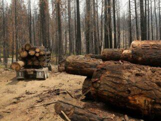 Лесовоз среди сгоревших деревьев, поваленный после прошлогоднего пожара недалеко от Гровленда, Калифорния, 30 июля 2014…
