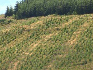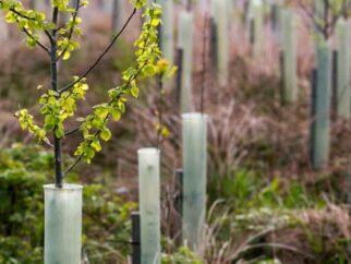 На фото: Молодые березы, защищенные пластиковыми трубами, на лесной плантации в Северных пустошах в Англии. Фотография:…