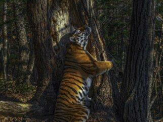 В пятнистом свете русского леса сибирская тигрица в одиночестве обнимает ствол древней маньчжурской ели. Эффектный…