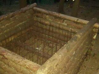 Ззовні пастка являла собою огороджений деревними колодами майданчик, в який встановлені загострені металеві прути У…