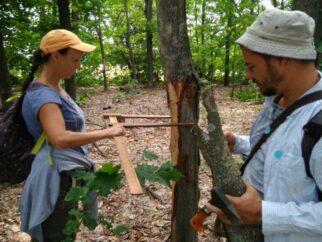 На фото: С. н. с. Зінченко О. В. і с. н. с. Скрильник Ю. Є. вивчають видовий склад комах у полезахисних лісосмугах Смотрю…