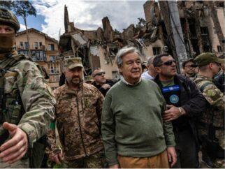 Антониу Гутерриш, генеральный секретарь ООН, в четверг в разрушенном районе города Ирпень, Украина. Фото Дэвид…