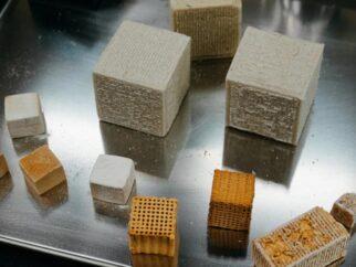 Исследователи сравнивают биоминерализованный мицелиальный каркас (внизу справа) с другими живыми материалами, построенными из гидрогелей и…