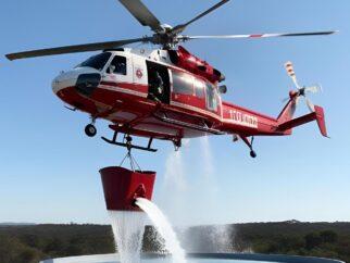 Иллюстрация пожарного вертолета, наполняющего ведро из «природного пожарного гидранта» – резервуара для хранения воды объемом…
