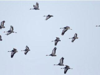 Даурские журавли летят в уезде Чхорвон-гун, недалеко от демилитаризованной зоны (ДМЗ) в южнокорейской провинции Канвондо. Фото:…