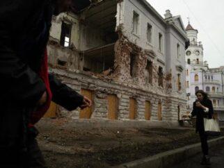 Женщина проходит мимо строения, разрушенного российскими бомбардировками в Сумах на северо-востоке Украины в четверг. (Флоран…