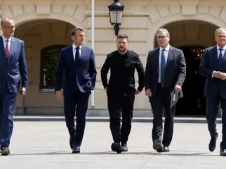 Слева направо: канцлер Германии Фридрих Мерц, президент Франции Эммануэль Макрон, президент Украины Владимир Зеленский, премьер-министр…